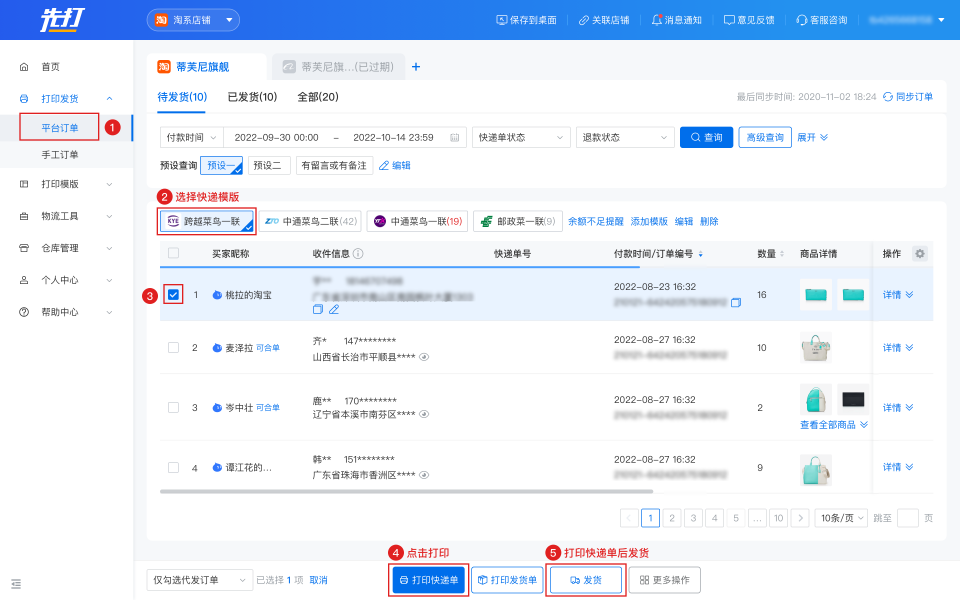 5?? 回到先打打單,點(diǎn)擊【打印發(fā)貨】【平臺(tái)訂單】頁面,選擇訂單并選擇快遞單模板后,點(diǎn)擊【打印快遞單】按鈕