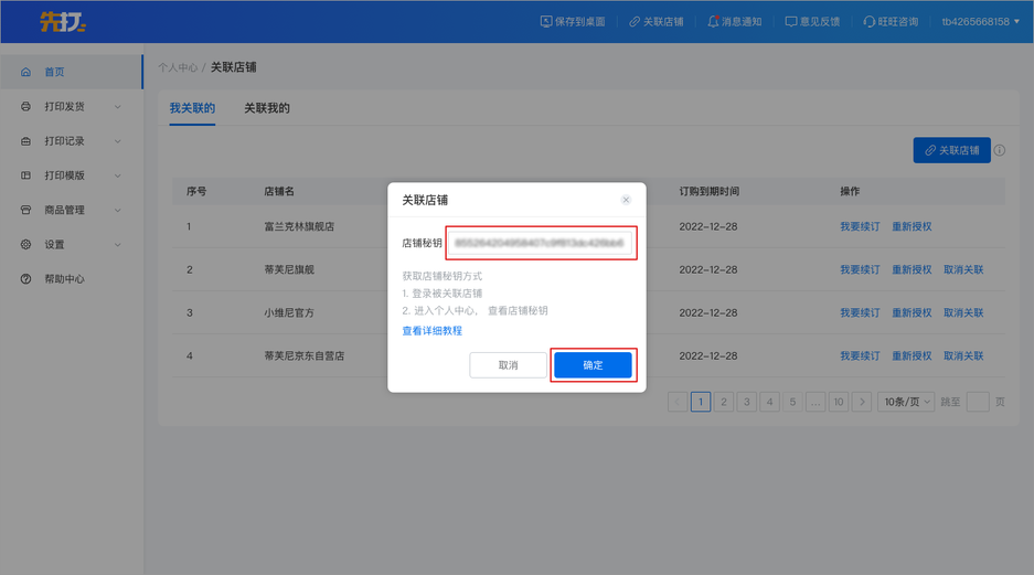 2?? 使用店鋪A授權(quán)登錄先打,進(jìn)入關(guān)聯(lián)店鋪,點(diǎn)擊關(guān)聯(lián)店鋪,粘貼店鋪B的秘鑰后提交