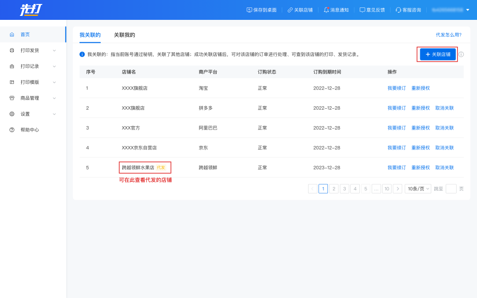 3?? 關(guān)聯(lián)店鋪后,登錄店鋪A的賬號(hào),也可選擇店鋪A的快遞模板打印發(fā)貨店鋪B的訂單,實(shí)現(xiàn)電子面單共享。