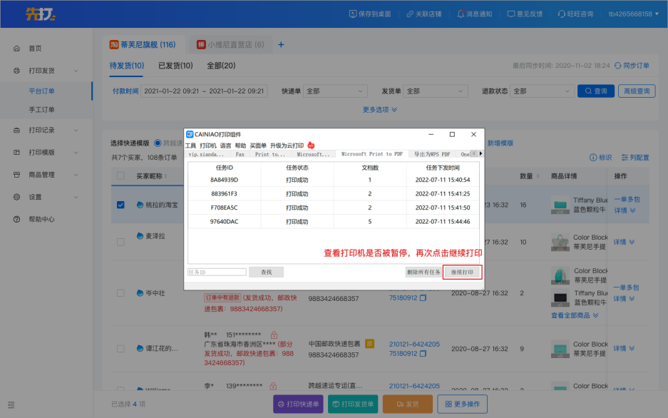 2?? 點(diǎn)擊打印發(fā)貨 ?? 平臺(tái)訂單,進(jìn)入需要代發(fā)的商家店鋪 ?? 選擇快遞模版 ?? 勾選訂單進(jìn)行打印發(fā)貨。