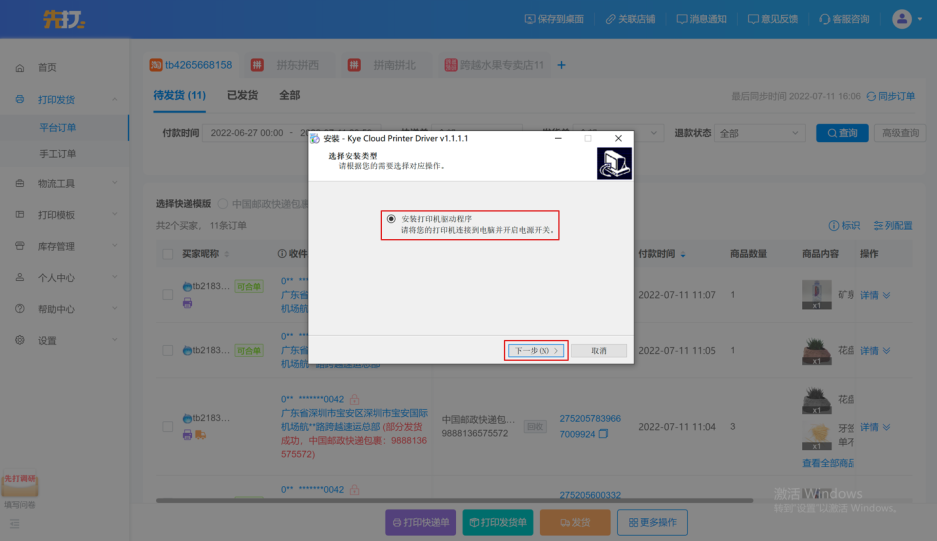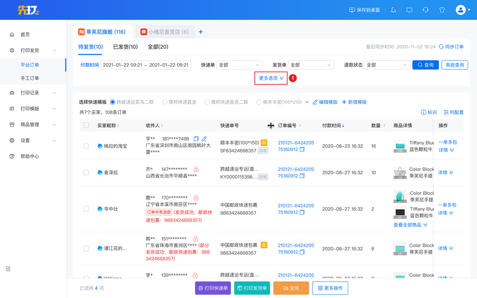 選擇打印發(fā)貨 ?? 平臺(tái)訂單 ?? 勾選需要打印的訂單和快遞單模板,點(diǎn)擊打印快遞單即可