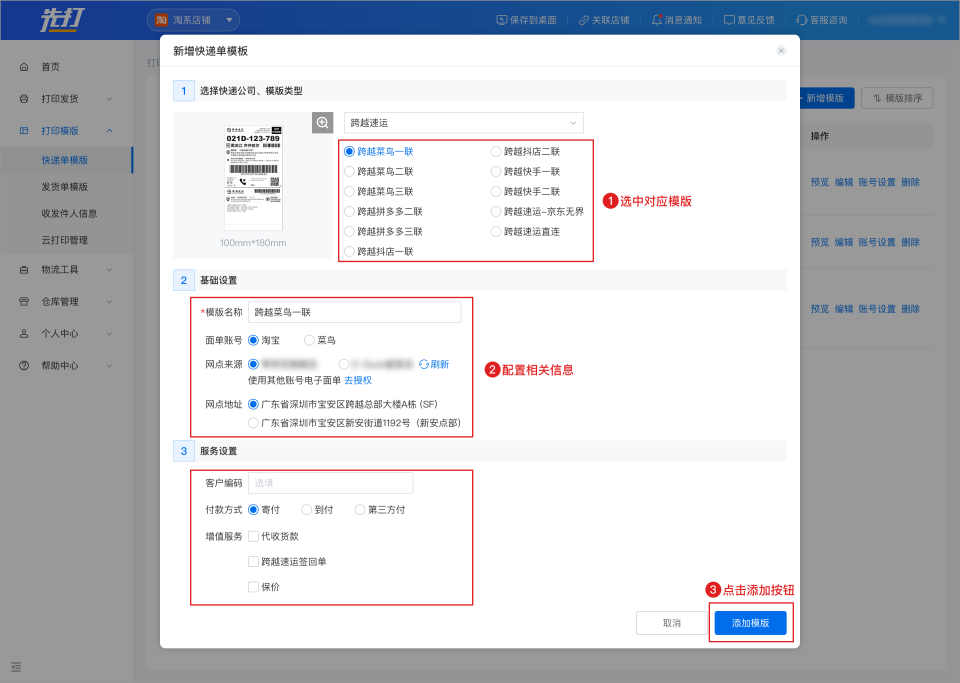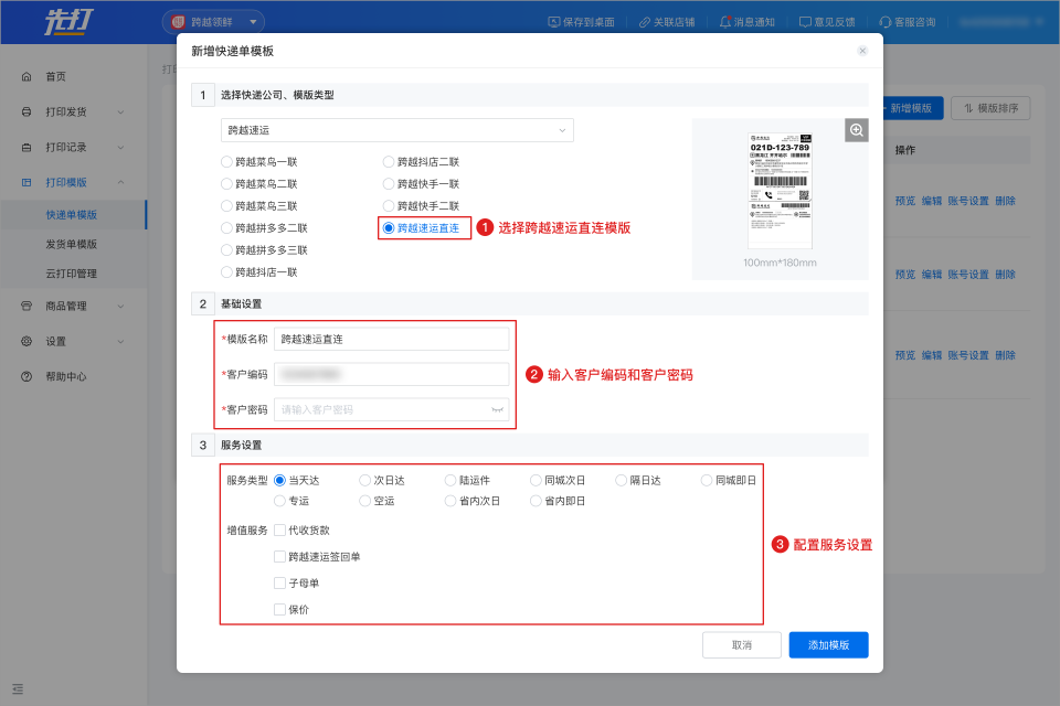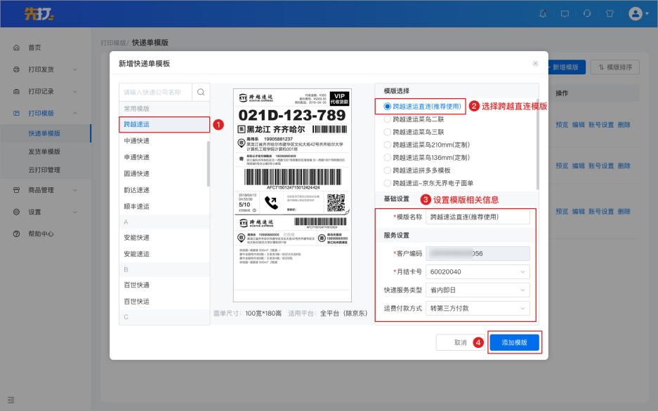 選擇或搜索“跨越”快遞公司,選擇直連類型的面單,填寫直連面單信息線下簽合同的客戶編碼/月結(jié)卡號(hào)、所需的增值服務(wù)、選擇快遞付費(fèi)方式及業(yè)務(wù)類型, 點(diǎn)擊添加模版