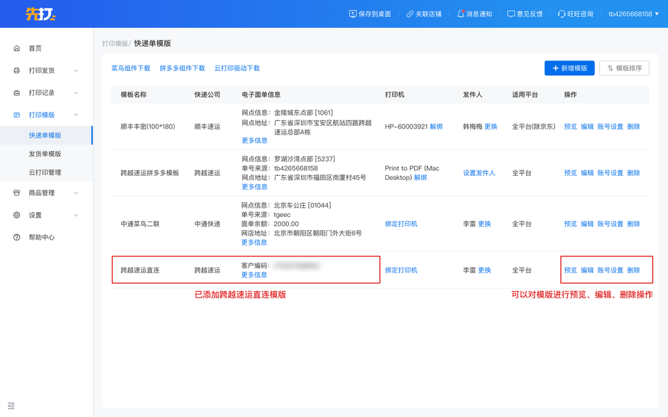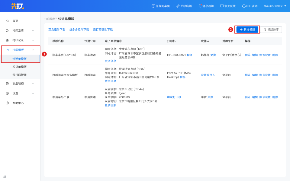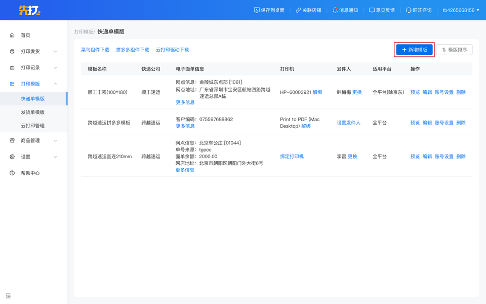 1?? 使用店鋪B授權(quán)登錄先打,打印模板 ?? 快遞單模板,點(diǎn)擊新增模板