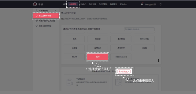 選擇豐橋服務(wù)中的第三方軟件對接,搜索/選擇“先打”軟件,再點(diǎn)擊“申請接入”。