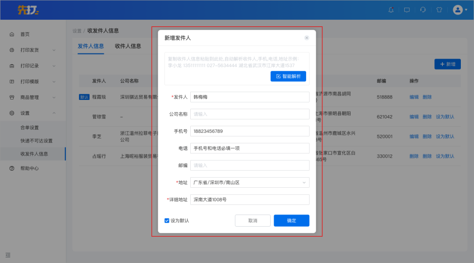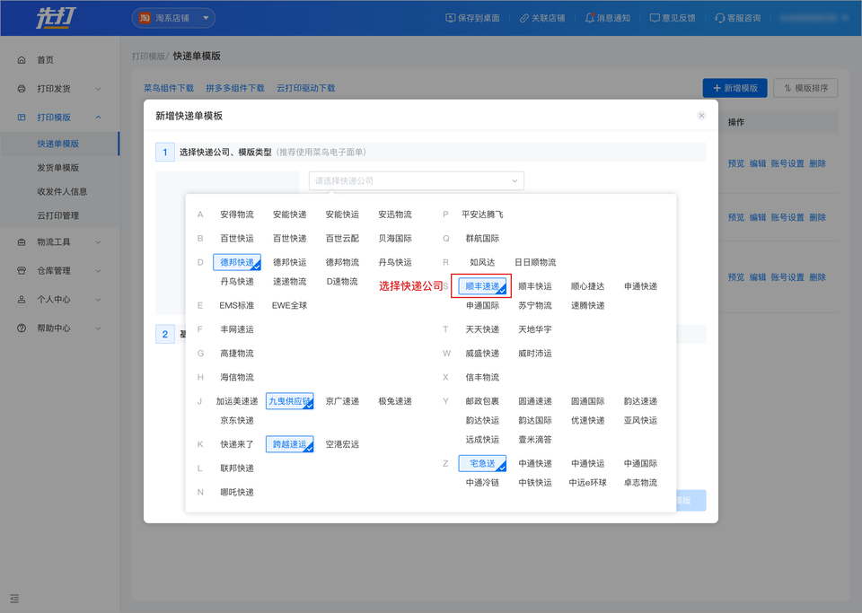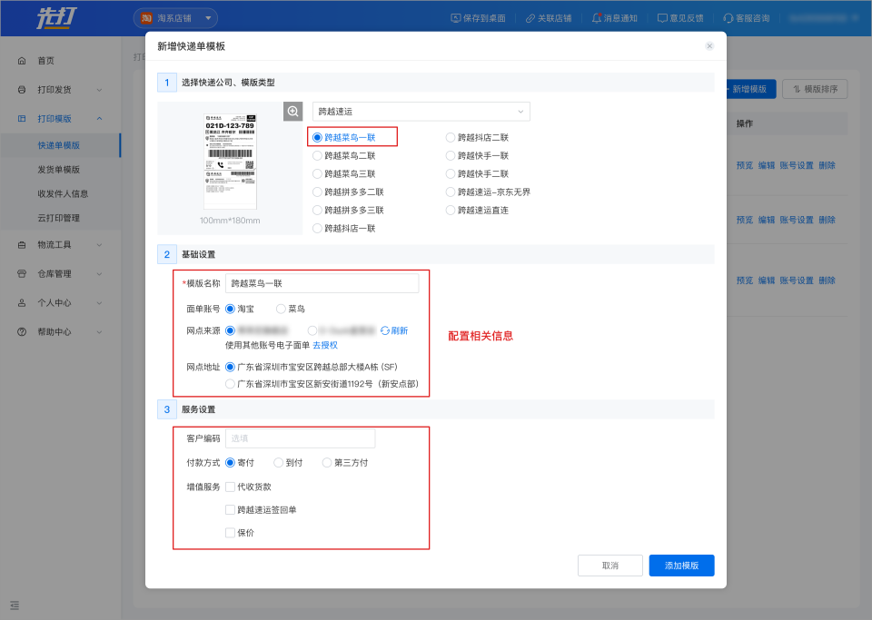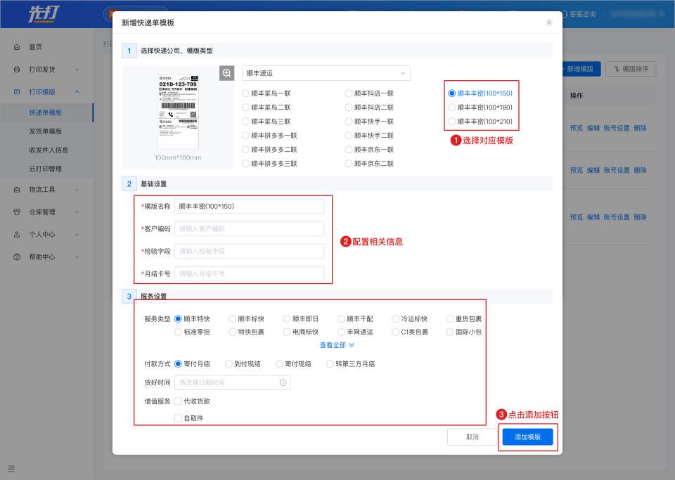 進(jìn)入【先打】系統(tǒng),選擇順豐直聯(lián)模板、面單類型、增值服務(wù),并填寫接入先打成功后生成的客戶編碼和校驗(yàn)字段的商家信息,順豐直連快遞模板成功添加后,即可打單發(fā)貨。