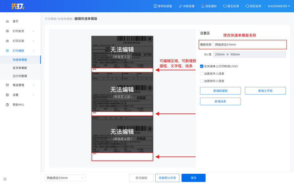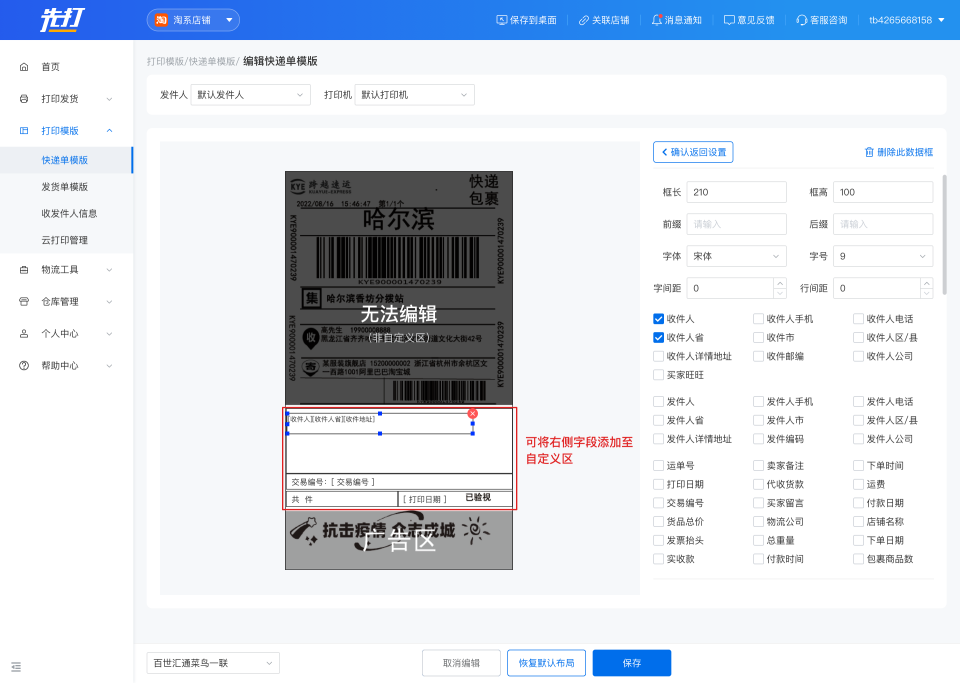 對快遞模板自定義區(qū)可以進(jìn)行添加信息,設(shè)置樣式