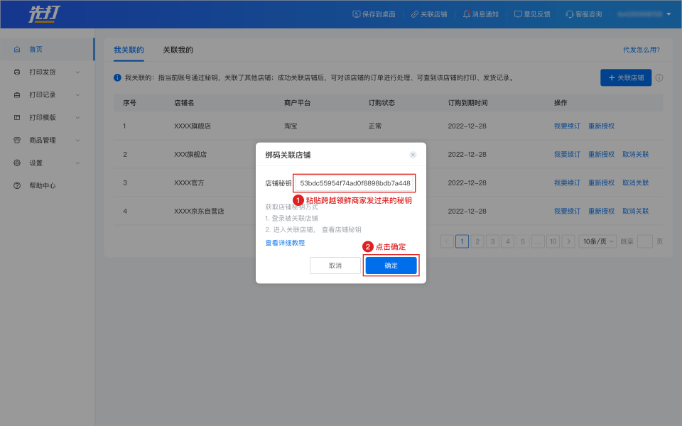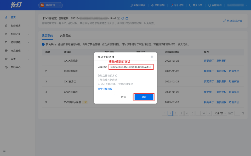 2?? 使用店鋪A授權(quán)登錄先打,進(jìn)入關(guān)聯(lián)店鋪,點(diǎn)擊關(guān)聯(lián)店鋪,粘貼店鋪B的秘鑰后提交