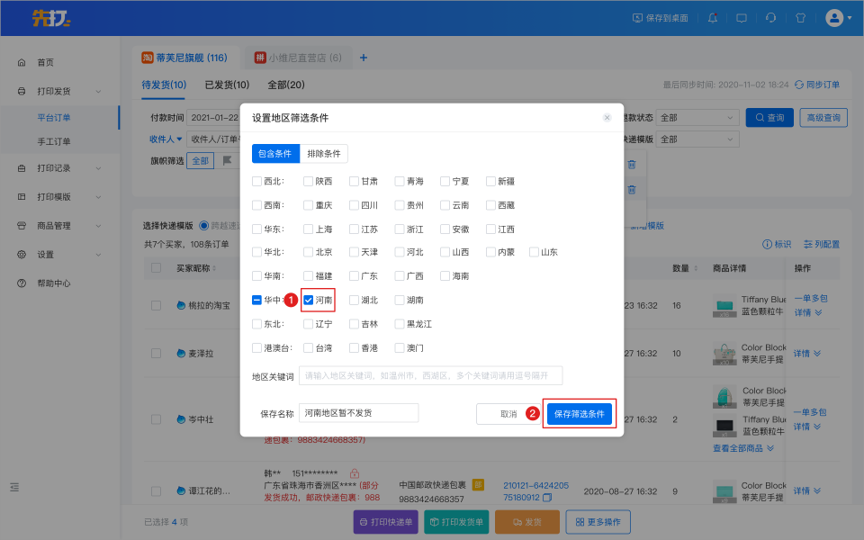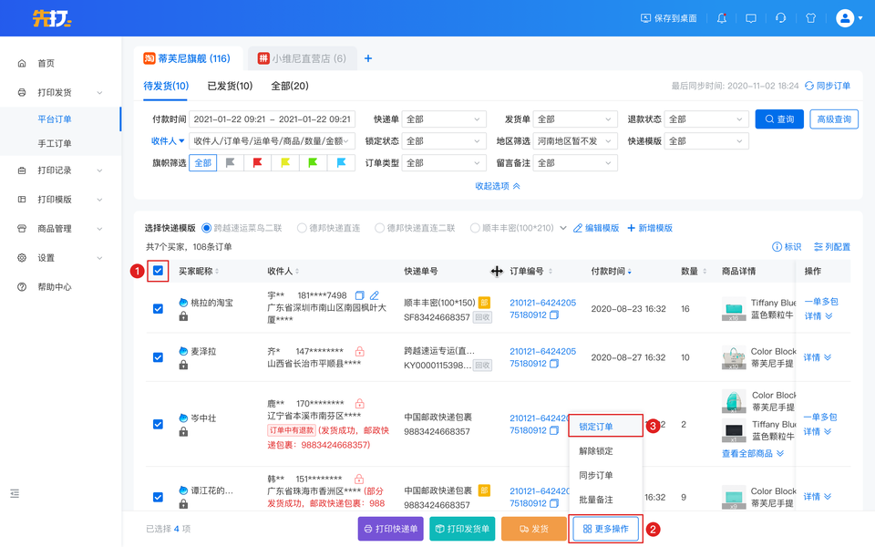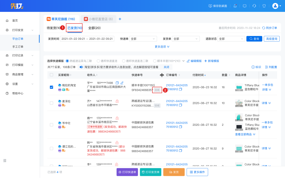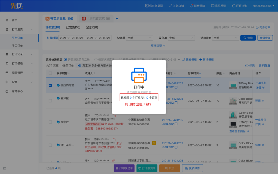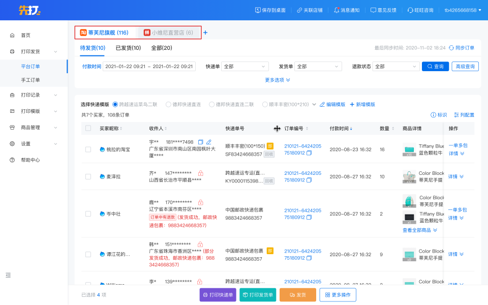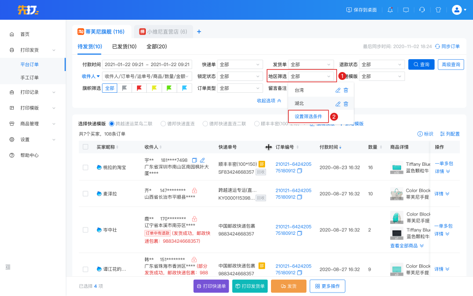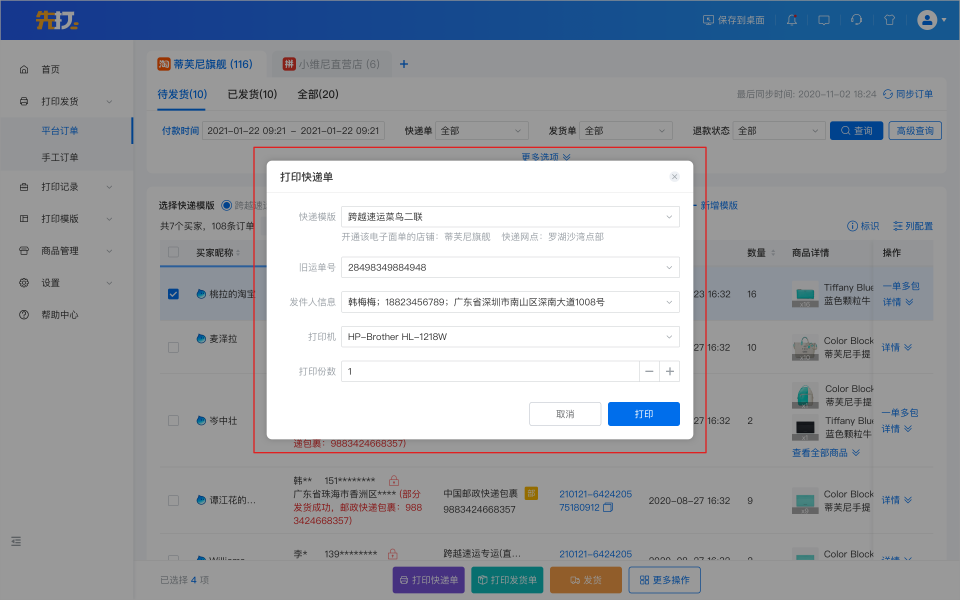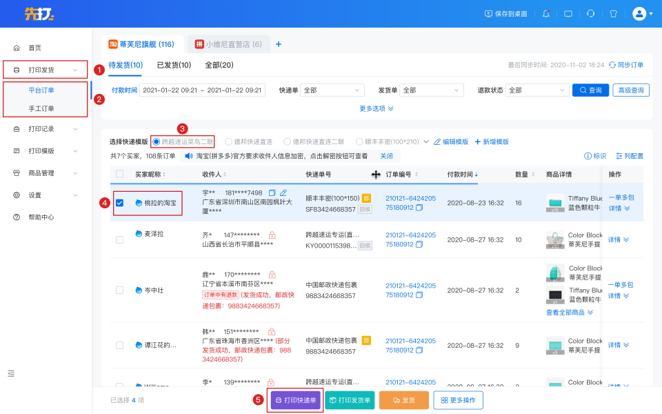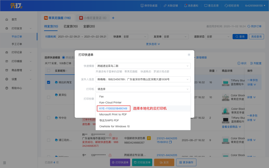 選擇打印發(fā)貨 ?? 平臺(tái)訂單 ?? 勾選需要打印的訂單和快遞單模板,點(diǎn)擊打印快遞單即可