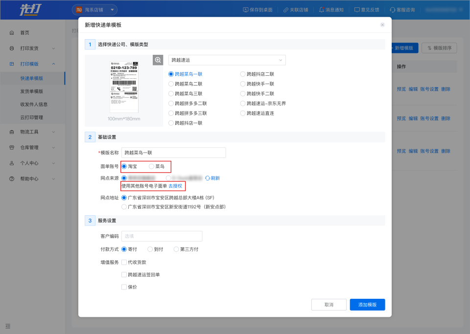 選擇快遞公司 ?? 選中需要添加的模版類型 ?? 設(shè)置電子面單來源、面單類型,網(wǎng)點(diǎn)、客戶編碼、業(yè)務(wù)類型等