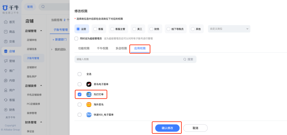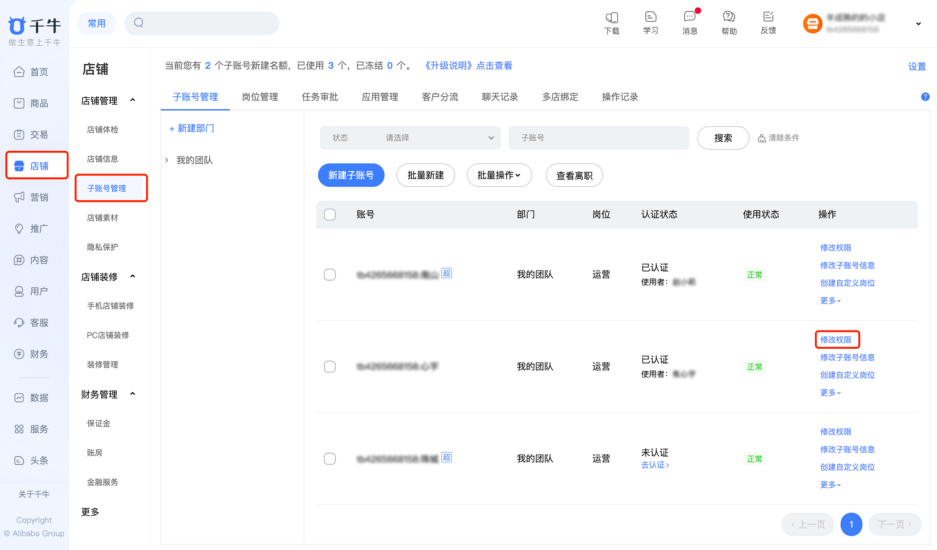 1?? Step 1:用主賬號(hào)登錄千牛,點(diǎn)擊 店鋪管理 ?? 子賬號(hào)管理 ?? 修改權(quán)限