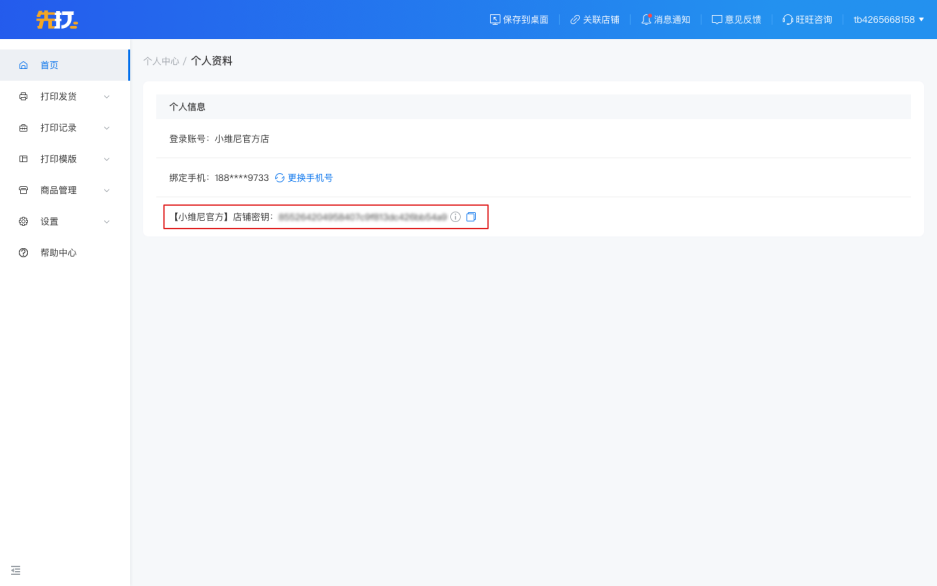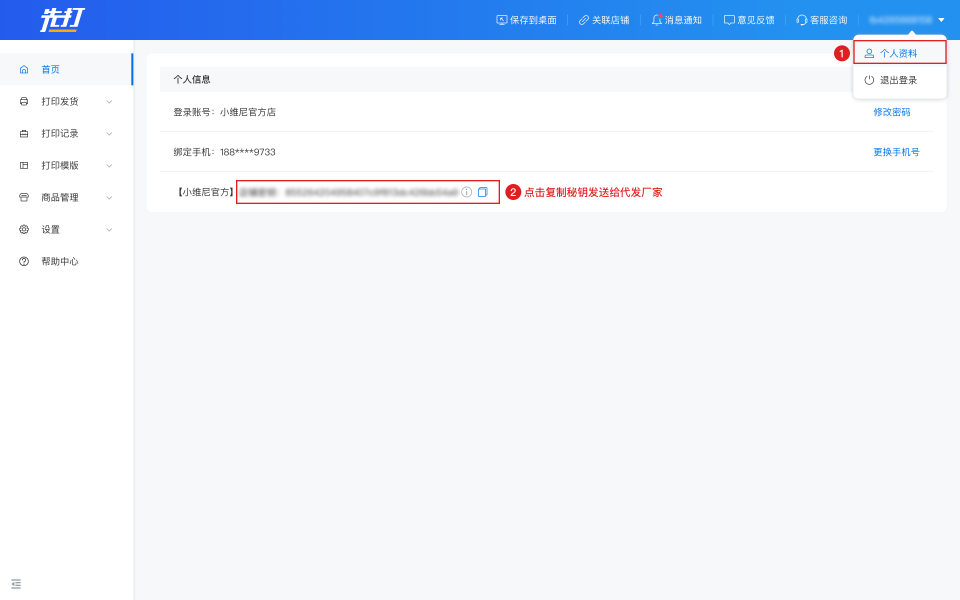 1?? 點(diǎn)擊個(gè)人資料,復(fù)制秘鑰并發(fā)送給代發(fā)廠家,等待廠家關(guān)聯(lián)店鋪。