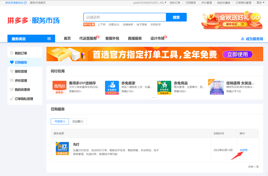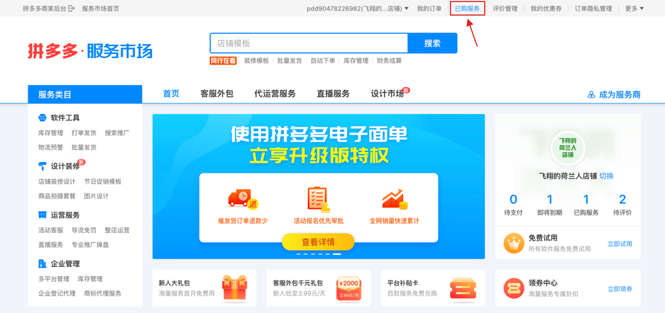 1?.在拼多多服務(wù)市場登錄您的店鋪:https://fuwu.pinduoduo.com/service-market/service-detail?detailId=195