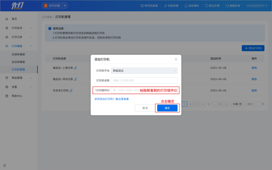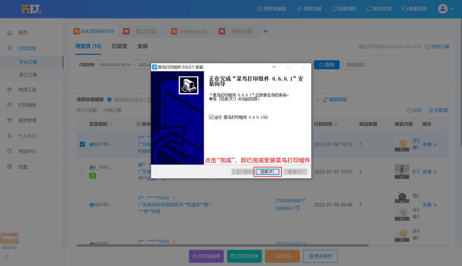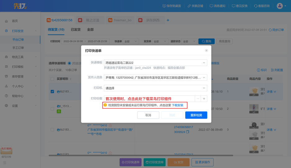 6?? 在打印彈窗中,選擇跨越打印組件,選擇模板尺寸類型和發(fā)件人信息,打印成功后點(diǎn)擊發(fā)貨
