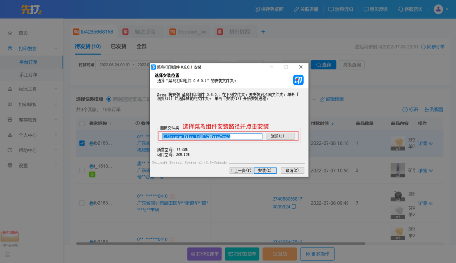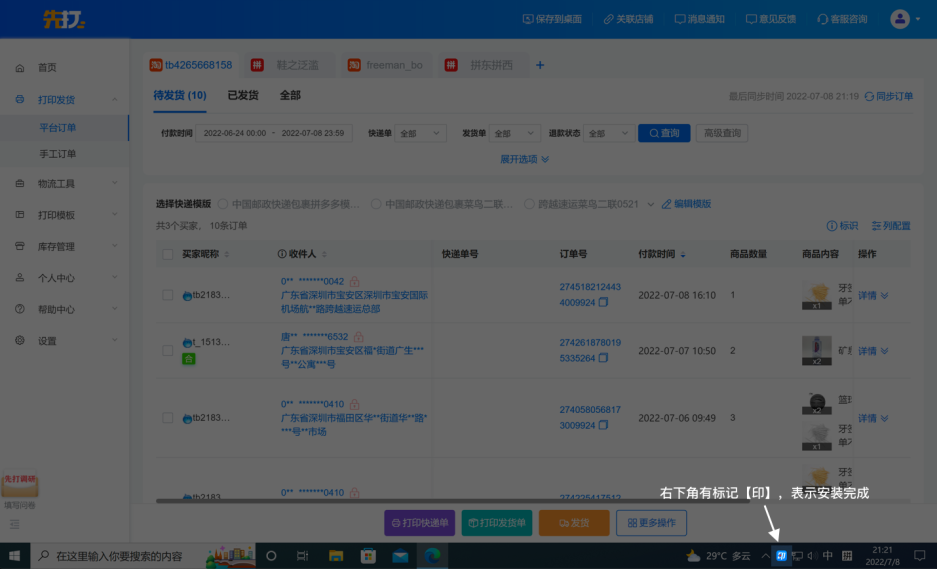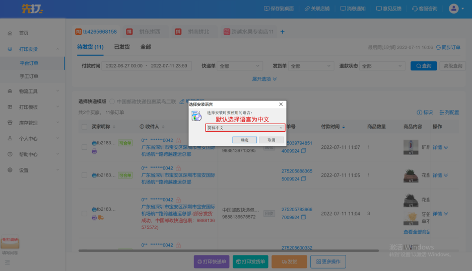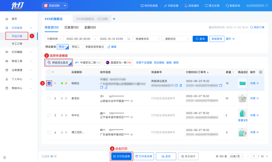 2?? 點(diǎn)擊打印發(fā)貨 ?? 平臺(tái)訂單,進(jìn)入需要代發(fā)的商家店鋪 ?? 選擇快遞模版 ?? 勾選訂單進(jìn)行打印發(fā)貨。