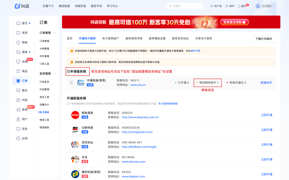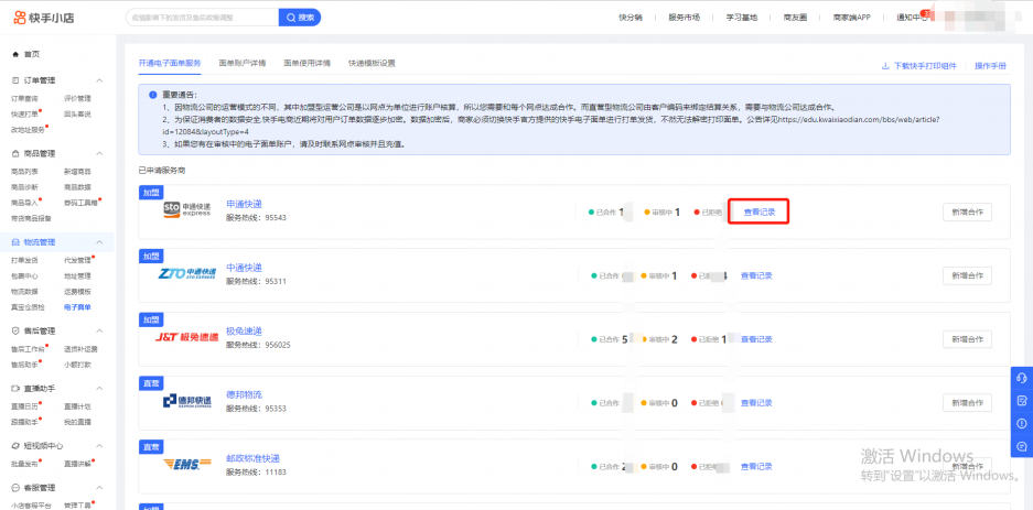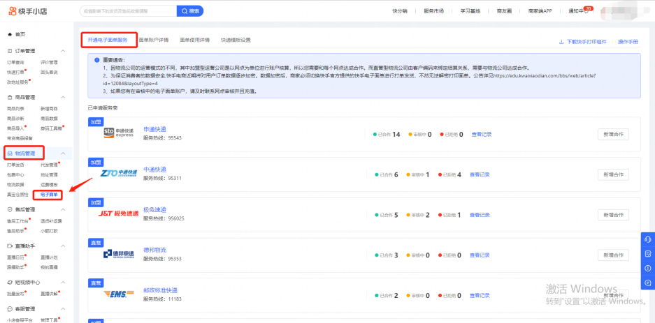 登錄快手小店后臺(tái) ?? 物流管理 ?? 電子面單 ?? 開通電子面單服務(wù)