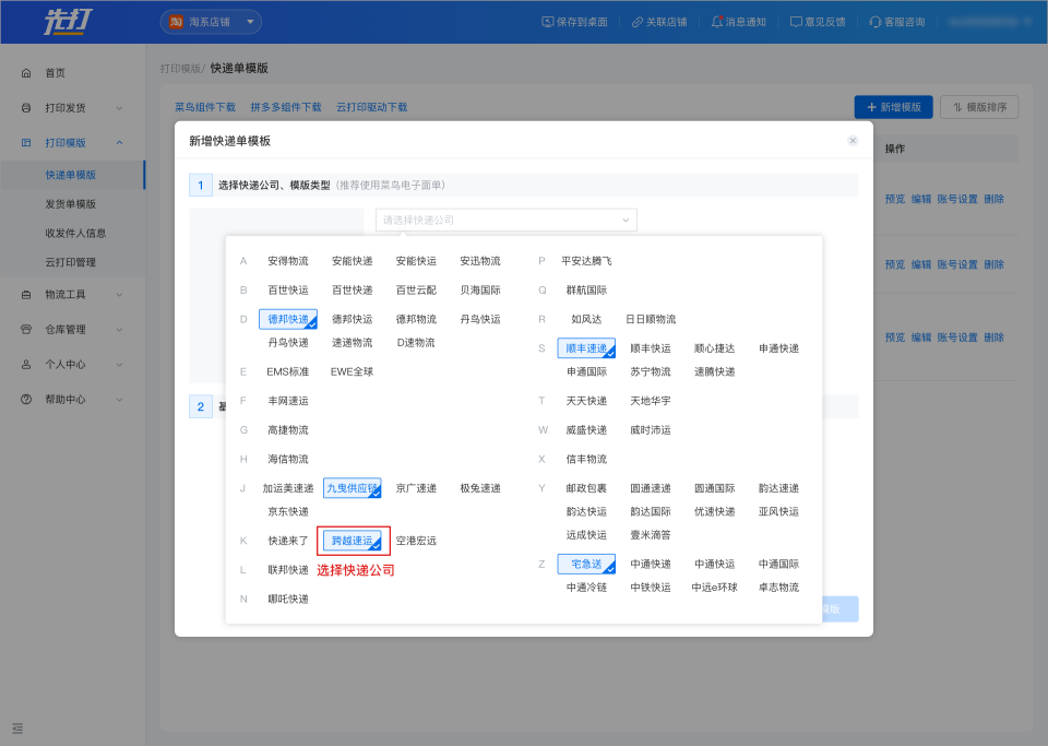 2?? 點(diǎn)擊跨越速運(yùn)物流,選中跨越直連模板(不要選跨越菜鳥、跨越拼多多模板)