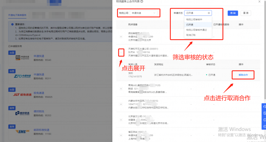 點(diǎn)擊【查看記錄】查看網(wǎng)點(diǎn)信息及審核狀態(tài),未成功開通的需要聯(lián)系物流公司負(fù)責(zé)人員進(jìn)行審核確認(rèn)