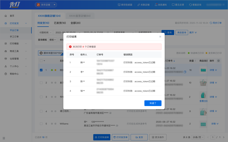 如果您在打印快遞單后,打印結(jié)果顯示“打印失?。篴ccess_token過期”,可能是因?yàn)槟目爝f單模版授權(quán)信息已過期所導(dǎo)致的。