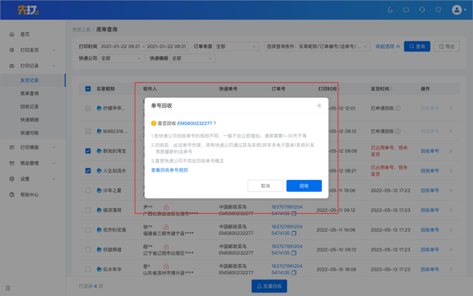 3. 可以使用單號(hào)回收再用功能,避免單號(hào)浪費(fèi),節(jié)約快遞單成本。
