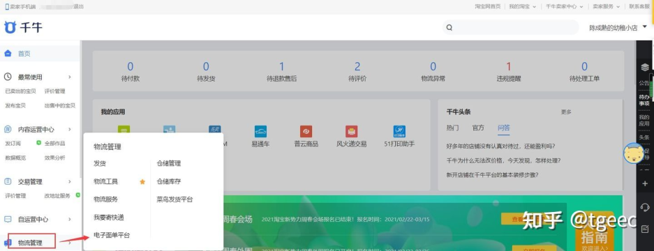 登錄千牛后臺(tái) ?? 選擇物流管理 ?? 電子面單平臺(tái)。